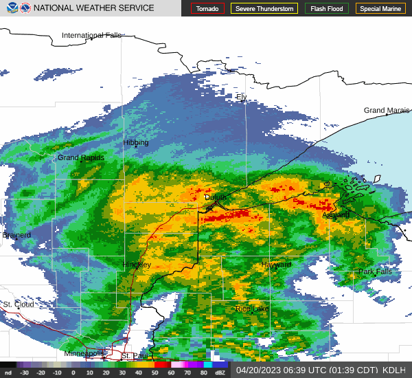 The Duluth, MN seasonal snowfall record was broken on April 20, 2023 during the first few hours after midnight covered by the radar animation. Heavy snow, occasionally mixed with sleet accumulated an inch an hour during this time. The intense red-colored precipitation echoes represent a change in the dominant precipitation type from wet snow to sleet.