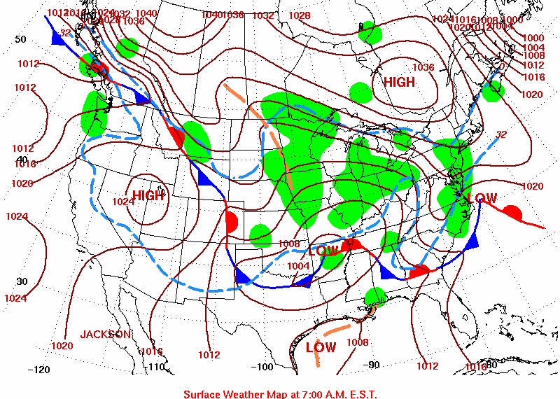 This is a classic cold air damming event with a high pressure ridge over the Middle Atlantic and Northeast states. The dashed 32 oF line shows the southward push of cold air with time. The dashed line is blue in the first two images, then green in the third image.